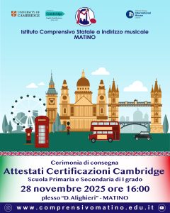 🇬🇧 Il prossimo 28 novembre a partire dalle ore 16:00 si terrà nel Plesso “D.Alighieri” la cerimonia di consegna degli attestati di certificazione Cambridge per i livelli S1, A1, e Ket A2.