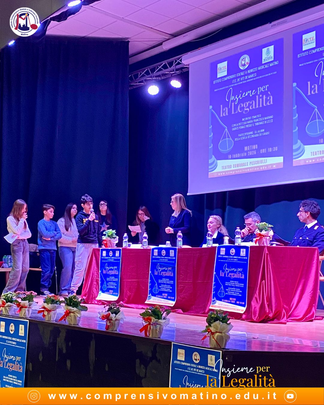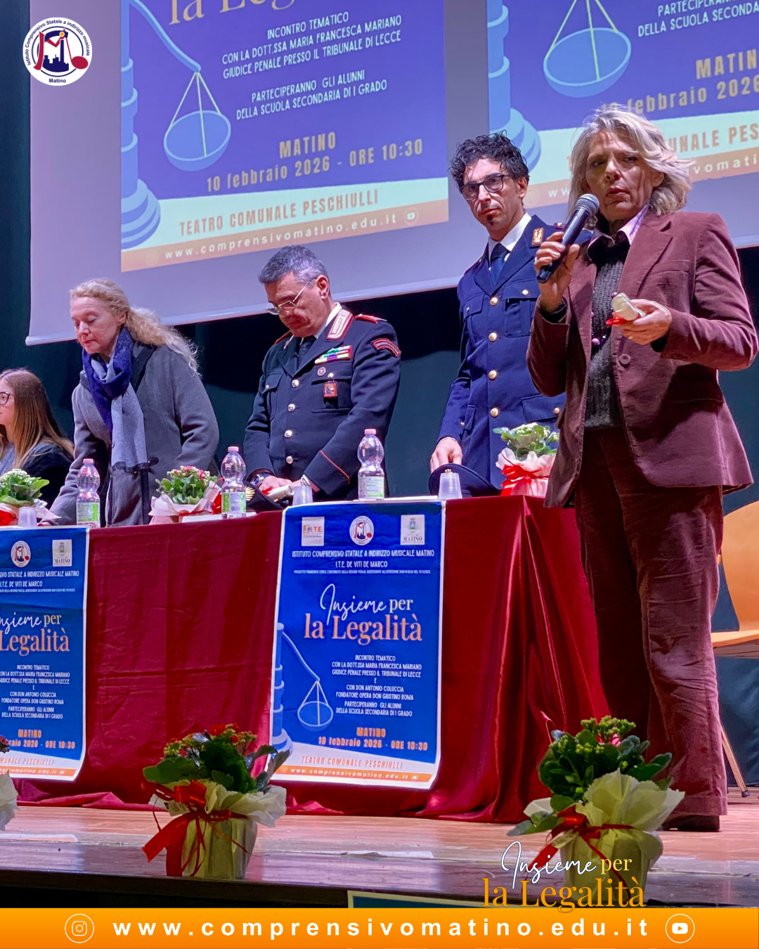 Oggi 10 febbraio 2026, al Teatro Comunale “G. Peschiulli” di Matino, l’I.C. Matino a indirizzo musicale, in collaborazione con l’I.T.E. “De Viti De Marco” di Casarano, ha promosso un importante incontro di riflessione sui valori di legalità, giustizia e responsabilità civica, rivolto agli studenti delle classi seconde e terze della Scuola Secondaria di I grado.