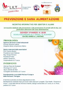 Le classi hanno partecipato a vari incontri di educazione alla salute nell’ambito del progetto “One Health, prevenire e vivere” promossi da LILT Lecce e tenuti da noti esperti del settore: Dott.ssa Veronica Chiarillo ( biologa nutrizionista), Dott. Giuseppe Ponzi (pediatra), Dott.ssa Flavia De Giuseppe (psicologa).